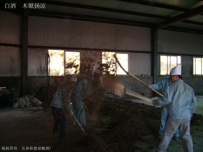 积德泉酿酒,从原料粉碎到成品酒装瓶有百余道工序,全靠手工完成。虽然锅炉早已取代了古老的烧大灶、拉风箱;地下鼓风也减轻了醅料扬凉时的劳累程度;高大宽敞的厂房、天窗和抽风机,轻而易举地解决了排潮散热问题,再不用看风向来开上、中、下窗了;化验检测也能事后提供参考依据……,但在实际工艺操作上,仍然得靠师徒传承、言传身教,并经长期体会,积累经验来准确掌握。