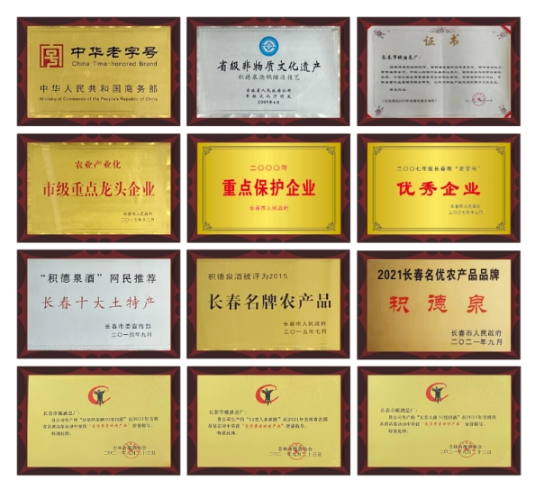 “积德泉”注册商标,连续荣获吉林省著名商标称号,其传统工艺产品有白酒、黄酒、滋补酒、烹调料酒等四个系列近80多个品种,年原酒综合产量可达8,000吨以上。各类产品都曾荣获过国优、部优、省优及市名牌等称号,拥有四类酒的生产资质,即白酒、黄酒、配制酒、调料酒,是国内罕有的综合型酿酒企业。2015年被市政府评定为“农业产业化市级重点龙头企业”单位。2020年被省政府评定为“省级农业产业化重点龙头企业”、区委区政府认定为“十佳农业产业化龙头企业”称号。