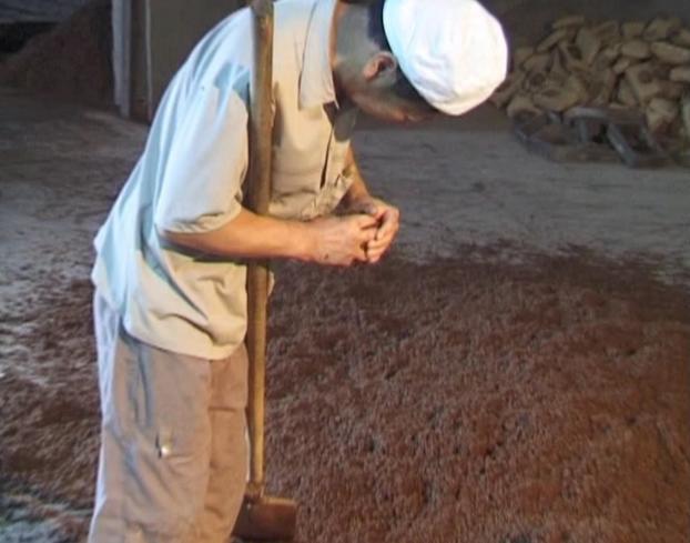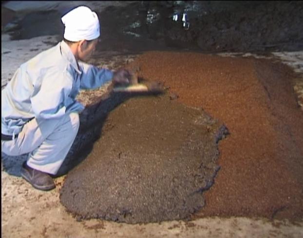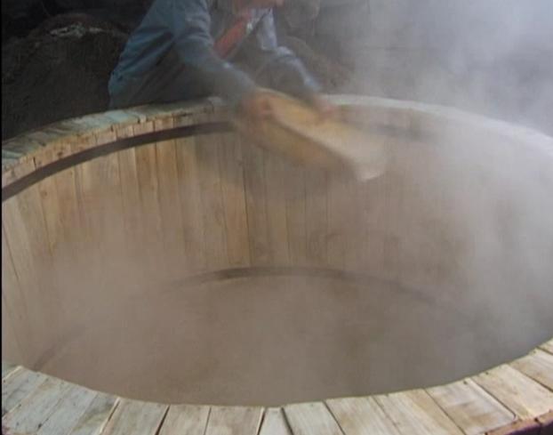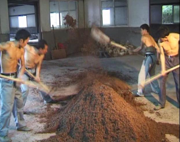 在积德泉白酒车间,有这样一句操作经叫“眼看、手抓、鼻子闻”,也叫“三勤(眼勤、手勤、鼻子勤)”。就是:蒸原料要达到“熟而不粘,内无生心”的要求,这就要靠眼看、手捏去体会;要掌握醅料入窖水分高低,酒师用手紧攥醅料,看指缝间挤出的浆多少,就会确定水分含量是30%、40% 还是50%、60%;在发酵窖池上用手掏个洞,抓出一把发酵醅,双手捧着象簸箕一样簸三下,捂在鼻子上一闻就知道有几个酒精份,该不该出窖蒸酒。