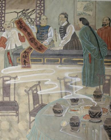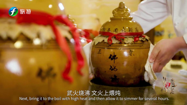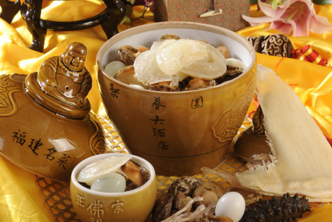 佛跳墙”是坛煨菜肴的精典,是源于福州,独具特色的闽菜代表,一般要有三十来种原料和配料,各种原料还要经过十几道初步加工后,再按原料性质、特点依次进绍兴酒坛里用微火煨制而成。主要工序有: