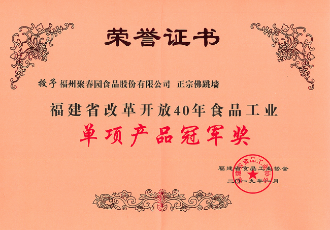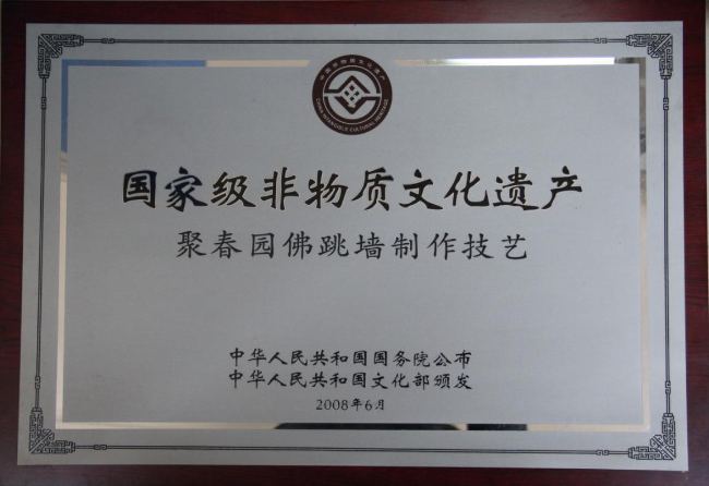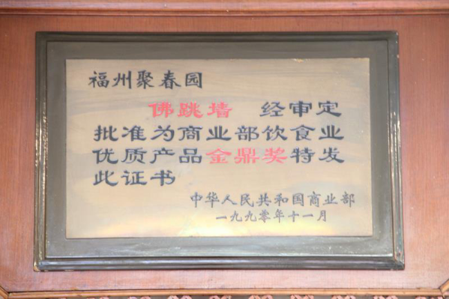 “聚春园”始创于1865年(清同治四年),是福建省现存年代最悠久的历史名店,1996年、2010年两次被国家商务部授予“中华老字号”。驰名中外的“佛跳墙”就源于聚春园,“聚春园佛跳墙制作技艺”是福建省唯一列入国家级非物质文化遗产的烹饪技艺。2009年“聚春园”被认定为福建省企业知名字号,2011年被认定为福建省著名商标。