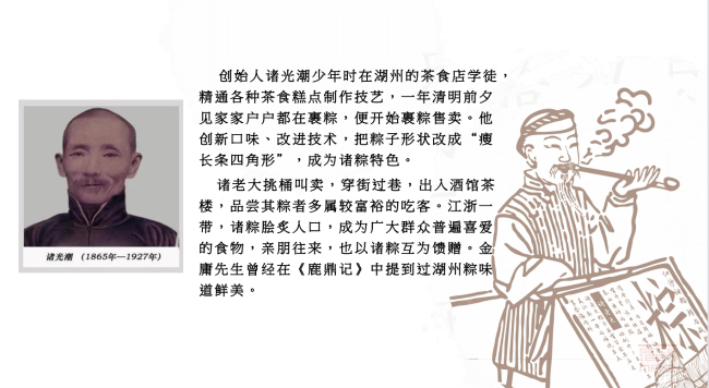 “诸老大”店铺。因其身材高大而被人亲切地叫做“诸老大”。诸老大大胆地将咸粽改进为“火肉粽”,又成功首创“猪油洗沙甜粽”。