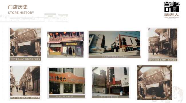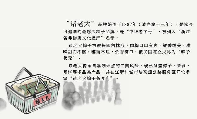 “诸老大”品牌始创于1 8 8 7年(清光绪十三年),是迄今可追溯的最悠久粽子品牌,是“中华老字号”,被列入“浙江省非物质文化遗产”名录。 诸老大粽子为瘦长四角枕形,肉粽口口有肉,鲜香糯美,甜粽甜而不腻,糯而不烂,余香满口,被民国陈立夫称为“粽子 状元”。 诸老大传承自嘉湖细点的江南风味,现已涵盖粽子、茶食、月饼等多品类产品,并在江浙沪城市与高速公路服务区开设多 家“诸老大现包店”。