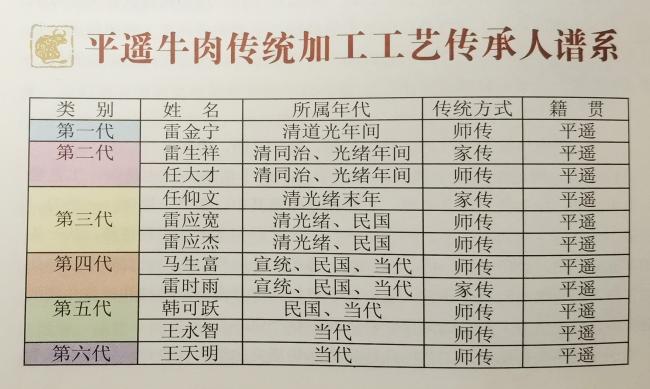 1948年平遥解放后,加工牛肉的屠宰房有38户, 1956年38户作坊组织为合作小组,后公私合营于县食品公司。同年食品公司建立牛肉加工车间,由兴盛雷第六代传人雷时雨任技术指导和生产负责人,并将加工牛肉的绝技,亲手传授给了食品公司10余名职工,使加工牛肉的绝技传留至今,不断发展。
