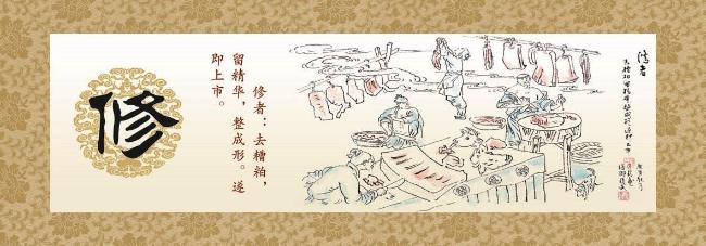 整修工艺。平遥牛肉的传统加工工艺中,晋商的诚信守义贯穿始终,自古熟肉都要经过严格的分类整修才得出售。通过整修,去糟粕、留精华、整成形。根据部位、优劣划定价格,存入地窖冰房待销修者:去糟粕,留精华,整成形。