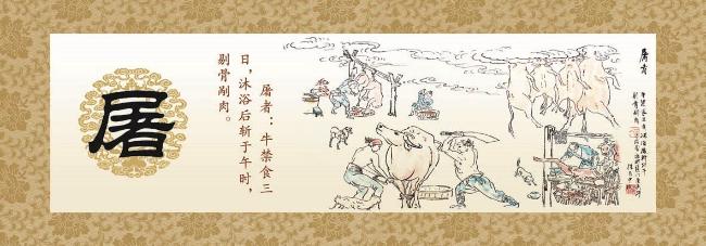 屠宰工艺。肉牛宰杀时,讲求净、静、稳。“宰前禁食三日,沐浴。宰时,平刀大拉,平静斩于午。”平刀大拉是先在牛的脖颈上长拉一刀,割断两根主动脉血管,让牛血尽快喷涌,全部放尽。瞬间宰牛排血,一是不使牛血渗入体内,保持牛肉色泽鲜艳;二是使牛在宰前不过分惊恐、紧张,防止了肌肉纤维因猛然收缩而造成的坚韧。好的屠宰师,往往眼明手快,手起刀落,杀牛剔骨、切割牛肉块前后仅需十五分钟。宰后剔肉时,技师十分注意保持包骨皮与牛组织神经、肌肉连接不断裂。