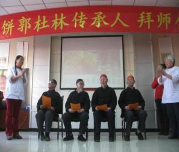 第三代:褚希发(1930-2021)山西汾阳人,中共党员,1945年12月参加工作,1971年任郝庄商场厂长。文鑫兴(1931-今)河北邢台人,中共党员,1951年参加工作,1963年任太原糖业烟酒公司清真食品厂厂长。王汝富(1934-2020)山西汾阳人,中共党员,1952年参加工作,1971年任太原副食品市场糕点加工厂厂长。张涛(1936-2020)山西晋中榆次人,中共党员,1952年参加工作,1955年调入双合成,1962年任太原市老香村厂长。这四位传承人为公私合营前后的“郭杜林”饼独特制作技艺的第三代传人。他们继承“郭杜林”饼传统的制作工艺,和面时手法飘逸,上下翻飞,如同划“负阴抱阳”的阴阳鱼,称之为“阴阳手”,三五分钟就搅拌均匀,面团韧度恰如其分。揉面时又称“太极手”,将面揉成光亮,不粘案板为佳。吊炉形制独特,烘烤火色温度人工控制,窖圈熟藏而使其味浓郁,感官特色明显,口感上佳。